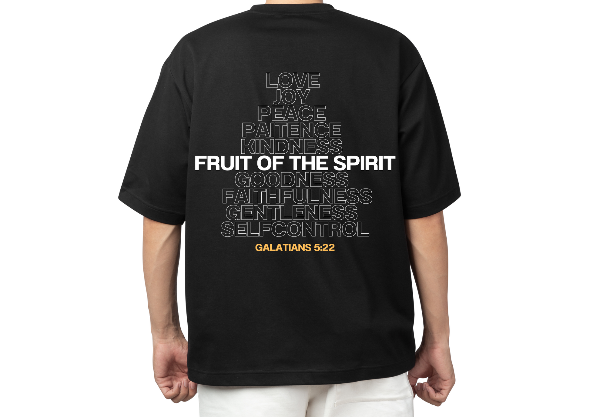 On the back, the Fruit of the Spirit flows downward in a striking vertical design, with each word—Love. Joy. Peace. Patience...—building on the next. Highlighted at the center: “Fruit of the Spirit.”